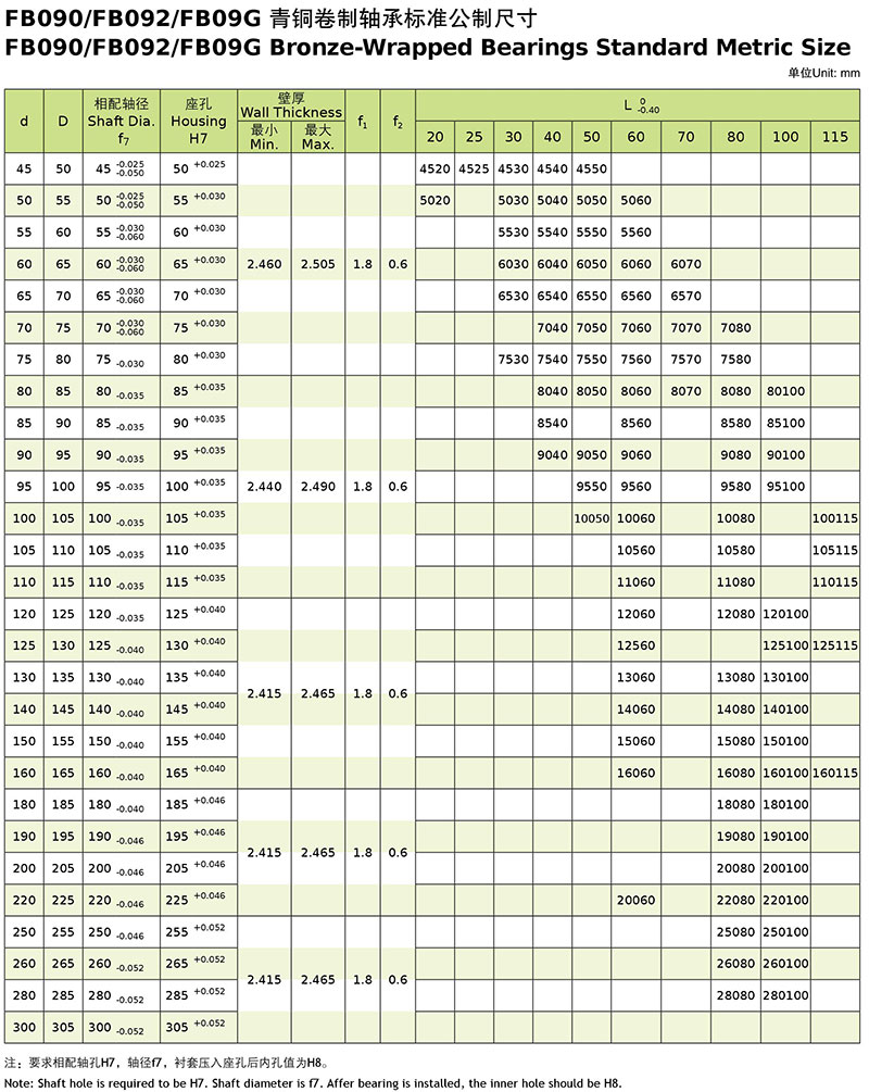 With the same production process and use conditions of FB090, it is based on the bronze substrate. The graphite-based solid lubricant is filled in its rhombus-shaped oil holes, so that the product could enjoy lower friction coefficient at the starting stage and in-use stage. Here, the good working condition could be still kept even though lubricating is unavailable within the short time. Therefore, it is widely used in the high load and medium speed positions such as engineering machinery, gearbox drive components, motor vehicle clutch as well as the rotary position for outdoor high-altitude facility.